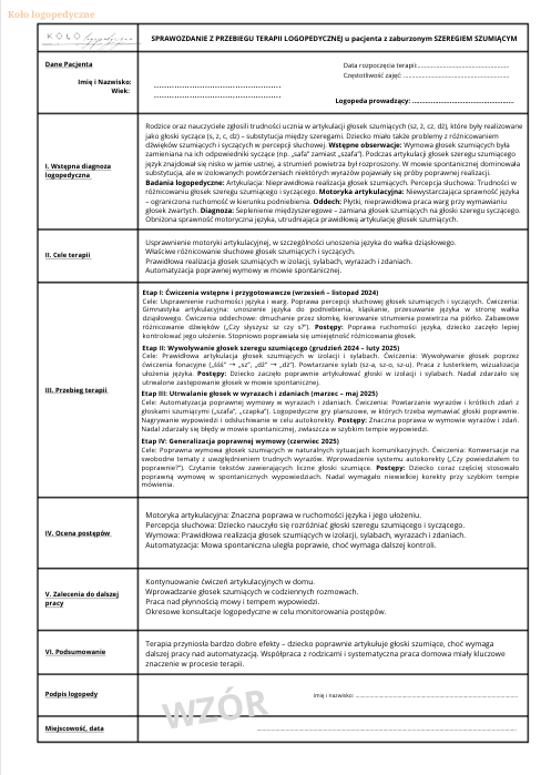 Każde sprawozdanie zawiera szczegółowy opis poszczególnych etapów terapii: od diagnozy, przez cele i przebieg zajęć, po ocenę postępów.